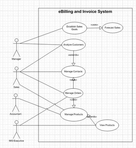 eBilling and Invoicing System Version 1.0 will address the following use cases. The complete usage scenarios will be completed during the information-gathering process. Use cases will be created and prioritized. Selected use cases will be expanded into usage scenarios and features that are derived from both use cases and the usage scenarios, as represented in the following diagram